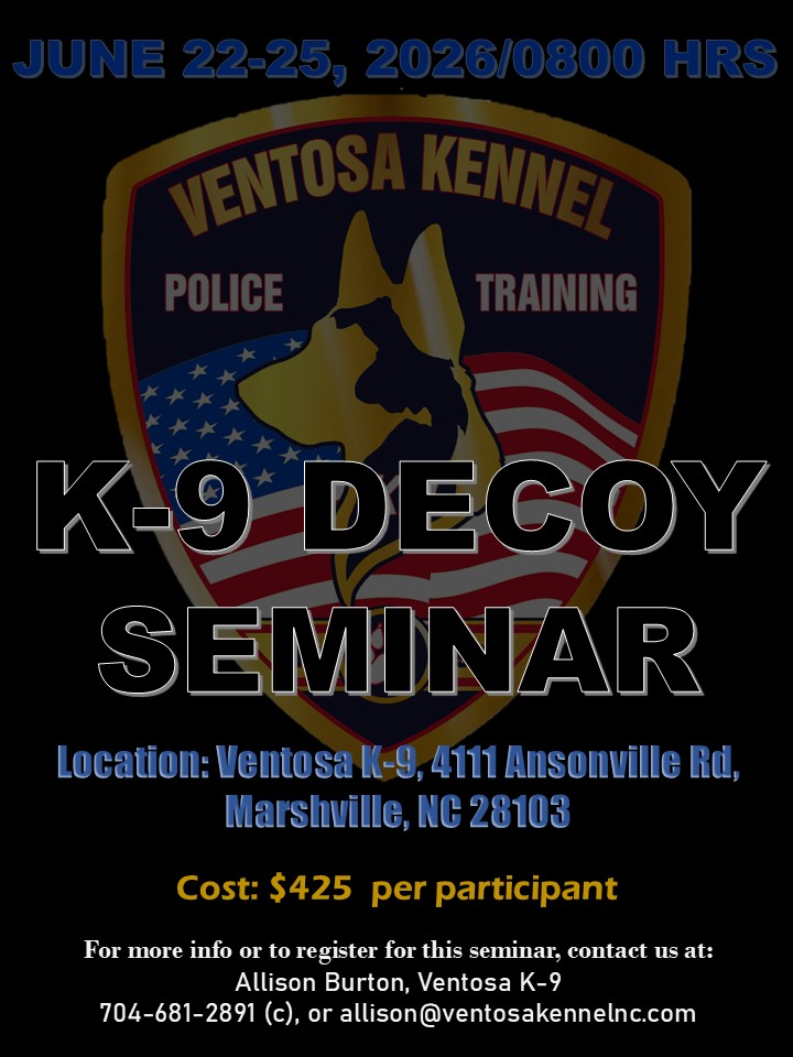 The 4-day Decoy Seminar will be limited to 10 full-time Law Enforcement applicants. For more information, including on how to register for this seminar, please contact us at 704–681-2891 (c), or al*****@ve*************.com